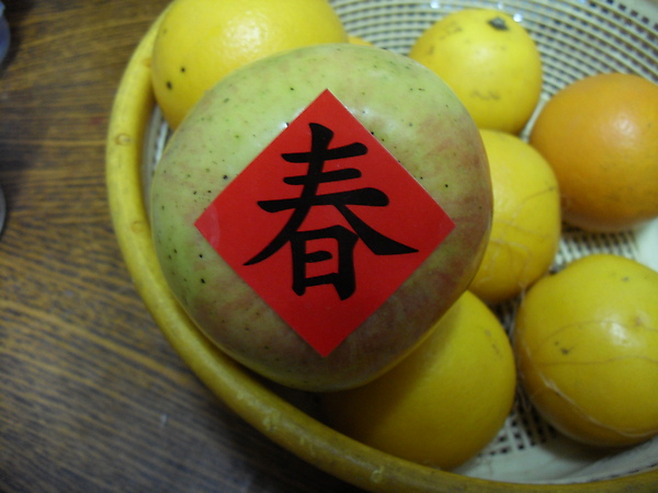 然後 接下來為晚上的年夜飯去家樂福補貨~回家時還有小禮物耶!!是貼了"春"字的蘋果~