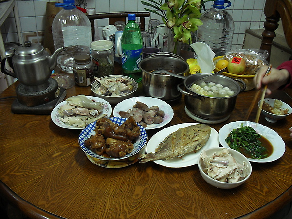 然後是重頭戲!!年夜飯啊~好豐富的菜色^^都是小時候的古早味呢!!還有我堅持要放的應景年菜~"年年有魚"~所以當然就不能吃囉!!魚是放好看的!!!